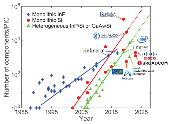 In addition, the integration of photonic elements such as lasers, modulators, photodetectors, and other passive devices has been exploited to complete certain functions in Si photonics integrated circuits (PICs). Besides the low-loss waveguides that are also interconnected with other elements, arrayed-waveguide gratings (AWGs), Mach–Zehnder interferometers (MZIs), and phase tuners can be integrated in a Si PIC [22]. To satisfy the specifications of a single Si PIC for application in different areas, including high-speed transceivers, LIDAR, optical computing, and quantum photonics, an increased number of elements on a single, large-scale Si PIC are necessary to provide high device yield. To improve the optical signal quality in a large-scale PIC, a balance between the number of channels, the optical losses, and amplification values must be reached. Evolution of the number of photonic devices integrated on a single waveguide, platforms including monolithic InP with integrated lasers, monolithic Si without integrated lasers, and Si substrate with integrated lasers are summarized in Figure 2 [22]. Figure 3 shows the progress over the past four years and the projection for the next two years. With the advent of quantum technology as one of several emerging technologies in the last decade, the idea of control and manipulation of physical objects at the quantum level has been considerably strengthened. Now, quantum technology’s aim is to successfully make quantum devices by the use of quantum physics.