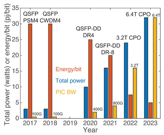 The evolution of PIC bandwidth, power efficiency, and total power consumption [22].