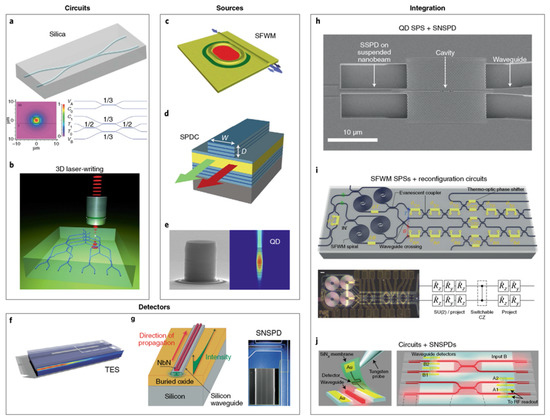 Integrated single-photon sources, detectors, and circuits. (a) The first IQP circuit for CNOT entangling gate in silica-on-insulator waveguides. (b) Laser writing quantum circuit in silica with complex 3D geometry. (c) An integrated SFWM-SPS in Si photonic waveguide. Engineering microresonator enables the generation of highly pure and indistinguishable photons. (d) An integrated SPDC-SPS in GaAs waveguides. A Bragg-waveguide that sustains two different types of eigenmode is engineered to meet the phase matching condition. (e) A semiconductor InGaAs/GaAs QD SPS able to emit near-deterministic and highly pure single photons from a single dot embedded in a micropillar. (f) An integrated TES SPD that is evanescently coupled to silica waveguides. Up to 5 photons guided in the waveguides can be resolved by the integrated TES. (g) An integrated SNSPD atop a Si waveguide that can absorb and detect photons with >90% efficiency. (h) An integration of a QD-SPS with SNSPDs in the GaAs photonic crystal waveguide system. It enables the detection of QD luminescence in a compact system. (i) An integration of SFWM-SPSs with re-programmable quantum photonic circuits in Si photonics. It allows the on-chip preparation, manipulation, and measurement of photonic states. (j) An integration of Si photonic circuits with SNSPDs by using the μm-scale flip-chip process. It allows on-chip measurements of nonclassical light [29].