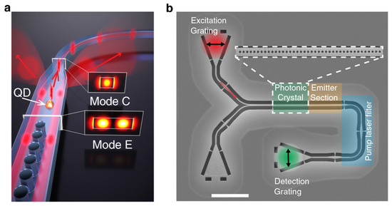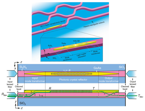 Here, the role of electrical connection was played by a thin gold layer—which acts as a strain transfer structure—and broadband backside mirror for the QD micromesa that was prepared by in situ electron-beam lithography [44]. Experimental results showed that the multiphoton suppression had not been influenced by spectral tuning [44]. Besides the development in the preparation of advanced materials such as the QD-based single-photon emitter employed for experimental demonstration of quantum technologies, the improvement in fabrication techniques also continued. For example, to achieve cavity mode resonance with a great enhancement of QD photoluminescence (PL) intensity, a precise calibration process of an Al0.9Ga0.1As/GaAs DBR micropillar cavity, which matched the single InAs/GaAs quantum dot (QD) exciton emission, was proposed [45]. Under a weak coupling regime, the light–matter interaction of single QDs in a DBR micropillar cavity (Q∼3800) was investigated by temperature-tuned PL spectra. In this study, a value of g(2)(0) = 0.070 was demonstrated using the second-order autocorrelation measurement and highly pure single-photon emission at high count rates was indicated by the estimated net count rate before the first objective lens was reached (1.6 × 107 counts/s) under continuous wave excitation [45]. A heterogeneous photonic integration platform was developed, allowing direct integration of GaAs waveguides and cavities containing self-assembled InAs/GaAs quantum dots that provide such capabilities in a scalable on-chip implementation [45]. In their experiments, a highly efficient optical interface between Si3N4 waveguides and single quantum dots in GaAs geometries was achieved which included quantum dot radiative rate enhancement in microcavities, and a path for reaching the nonperturbative strong-coupling regime [45]. Davanco et al. [46] indicated that robust implementation of single-photon sources can be achieved through the use of systems that provide both strong light–matter interactions and a low-loss interface between emitters and optical fields (Figure 7). Uppu et al. [47] reported a coherent and stable single-photon source that simultaneously achieves high purity (g(2)(0) = 0.020 ± 0.005), high indistinguishability- (V = 96 ± 2%), and >80% coupling efficiency with the waveguide. Such a ‘plug-and-play’ single-photon source can be integrated with on-chip optical networks implementing photonic quantum processors (Figure 8). As can be seen from the figure, the taper section is responsible for the collection and guidance of the squeezed emission out of the waveguide. The fundamental mode is reflected by a mirror prepared from a photonic crystal and, therefore, the directional out-coupling of the QD signal becomes available. The excitation and collection spots are highlighted with red and green spots. The fundamental and first-order modes of the waveguide are excited by a Y-splitter.