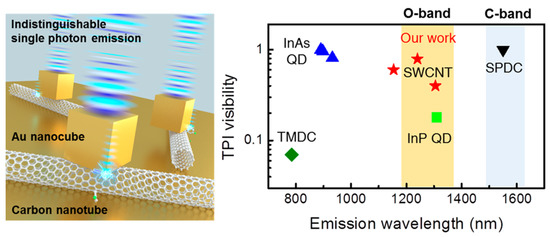As mentioned above, the emission of most QD-based SPEs is in their relevant telecom bands (1.3–1.55 μm) and the line of randomly distributed defect centers in GaN and SiC which can emit in the O-band. Nevertheless, GaN and SiC quantum emitters are suffering from a lack of emission wavelength control and photon indistinguishability, and single-photon emission remains incoherent in these materials due to strong exciton dephasing. High-throughput fiber-based quantum networks dictate that the emission line of quantum materials must be located in the desired telecom band without a priori lossy frequency conversion through nonlinear optical processes [57]. Previously, the emission in the O-band (1320 nm) was only observed from epitaxially grown InAs QDs able to display photon indistinguishability at 4 K, albeit rather low two-photon interference (TPI) visibility of only 0.18 without post-selection, partly due to a limited four-fold Purcell effect of the utilized dielectric cavity [58]. To overcome these limitations, quantum emitters which can deliver high-purity single-photon states directly in the telecom O-band and C-band under room temperature conditions need to be developed. Due to the unmatched ability of single-walled carbon nanotubes (SWCNTs) for integration with plasmonic nanocavities, significant attention has been devoted to the preparation of single-photon emitters with their length controlled in the nanometer scale. It was confirmed that energetically deep exciton trapping potentials and emission wavelength tunability of single-walled carbon nanotubes are available via aryl-based sp3 defect sites. These defects are formed using the covalent sidewall functionalization due to the structural diversity of SWCNTs. It should be noted that sensitizing of covalently generated point defects and enabling ultimate control over their quantum properties depend on the functional group and binding configuration of the nanotube [57]. Furthermore, SWCNTs also allow electroluminescence enabling of fully integrated quantum photonic circuits including sender and receiver modules. Indistinguishable single-photon generation directly in the telecom O-band was achieved by aryl-functionalized carbon nanotubes by overcoming the emitter quantum decoherence with plasmonic nanocavities [57]. The schematic presentation of a carbon nanotube quantum emitter can be found in Figure 12. In experiments, with the coupling scheme, the generated unprecedented single-photon spontaneous emission time was reduced to 10 ps (from an initial 0.7 ns) [57]. As was shown by the authors, the visibility of two-photon interference reached 0.79 at 4 K, even without applying post-selection. With single-photon purities of up to 99%, they achieved cavity-enhanced quantum yields of up to 74% and Purcell factors of up to 415. Their results established the capability to fabricate fiber-based photonic devices for quantum information technology with coherent properties that can enable quantum logic [57].