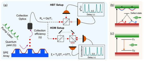 Currently, as emerging materials for technological applications, two-dimensional (2D) compounds are able to play a critical role in the advancement of nanophotonics and quantum technology. In this way, a wide range of polaritonic states and ultraconfined optical fields can be used to build the quantum nanophotonics field, where the quantum mechanical nature of the electrons and polaritons and their interactions become relevant [63]. The intrinsic quantum nanophotonic phenomena, such as quantum nonlocal effects, ultrastrong light–matter interactions, Cherenkov radiation, polaritonic quantization, and topological effects that can be observed in 2D materials, provide an expectation of receiving new nanophotonics modes [63,64]. A quantum emitter is one of the potential applications of 2D materials in a variety of quantum technologies and nanophotonics which are engineered by isolated color centers and quantum dots embedded in 2D materials [65]. Recently, the nonclassical light emission from van der Waals crystals and atomically thin two-dimensional materials were reviewed by Toth and Aharonovich [65]. In their study, transition metal dichalcogenides and hexagonal boron nitride were selected as 2D material samples. From a technological point of view, different aspects of quantum emission in these systems and proof-of-concept experiments—including tuning of the emission wavelength, electrical excitation, and coupling of the emitters to waveguides, dielectric cavities, and plasmonic resonators—which provide a foundation for their integration in on-chip nanophotonic circuits, were discussed [65]. Finally, they explained current challenges in the field and provided an outlook on further stimulations for scientific discussion. The thicknesses of this kind of material are in the range of atomic dimensions which brings about their ability for integration with electronic and photonic devices, facilitating precise engineering of light–matter interaction at the nanoscale. Two-dimensional materials with well-controlled and tunable optoelectronic properties can largely be produced in a library. It is possible to stack them with precisely controlled alignment and orientation. Therefore, they can provide a unique platform for the realization of atomically smooth and thin heterostructures, known as van der Waals (vdW) heterostructures [66]. Consequently, it is expecting that novel quantum phenomena such as quantum light generation spin qubit applications, valley spintronics, and so on to be explored using the unique set of 2D material properties [66]. There are four main fields of 2D material applications in nanophotonics: quantum sensing, polariton engineering, extreme light–matter interactions, and single-photon generation, manipulation, and detection. In terms of quantum sensing and superconductivity, the exploration of new electronic transport hydrodynamic behaviors is probed on the basis of polaritons. However, polariton engineering with 2D quantum materials is possible by twisting angle and stacking order control in van der Waals heterostructures. The extreme light–matter interactions enabled by the strong confinement of light at the atomic level by 2D materials can provide new tools to manipulate light fields at the nanoscale (e.g., quantum chemistry, nonlocal effects, high Purcell enhancement) [66]. Finally, quantum technologies can generate, manipulate, and detect single photons using 2D materials. In recent years, the demonstration of atomic defect-based single-photon emitters (SPEs) in transition metal dichalcogenides and hexagonal boron nitride has gained a lot of attention. Single-photon emitters based on 2D materials play a critical role in quantum cryptography, quantum communication, quantum information, and quantum sensing. Therefore, it is expected that the establishment of integrated single-photon emitters (SPEs) on quantum photonic circuits will be considerably important. As has been pointed out by Azzam et al., several metrics dictated by the targeted application requirements must be satisfied by an ideal SPE to be at the heart of numerous quantum technologies. The most critical metrics are brightness (Re) single-photon purity, and indistinguishability (ξ). Brightness (Re) can be expressed as the product of the rate of the incident pulsed laser, quantum yield (Q), and collection efficiency (η) that determines the extraction rate of photons from the system [66]. As can be found from Figure 13a, the radiative lifetime (T1) of the emitter indicates the maximum extractable rate of the system. Single-photon purity, defined by the value of a second-order autocorrelation function at zero time delay g(2)(0), which is generally measured through a Hanbury Brown and Twiss (HBT) interferometer, is shown in Figure 13a [66]. This factor is used to quantify the SPE nonclassical behavior one at a time. Importantly, a simultaneous high brightness and purity are required to avoid a vacuum component with high probability amplitude [66]. As is depicted in Figure 13a, Hong–Ou–Mandel (HOM) interferometry is used to determine indistinguishability (ξ). That factor is important in quantifying how well defined the spatiotemporal mode of two photons emitted from the same or different emitters is by measuring the two-photon interference visibility [66]. From a practical point of view, yield, scalability, and reliability of each technology are very important for the preparation of single-photon sources. These parameters are affected by working temperatures, blinking, bleaching, spectral wandering, site control, etc. Englund and Toth [67] concluded that most quantum photonic applications require purities [g(2)(0)] well below 0.01, indistinguishability (ξ) above 0.99, extraction efficiencies (Q.η) above 0.99, and brightness in gigahertz. In Figure 13a, a pulsed pump laser at a repetition rate of Te is shown for excitation of the system. A photon with a probability of Q (quantum yield) per pulse wa