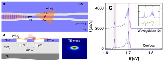In their work, a van der Waals heterostructure of WSe2, on a nanopillar array to yield electric field-tunable single-photon emission at locations with induced strain, was employed [68]. In addition, the electric and magnetic fields were used to generate the spectrally tunable single-photon sources at predetermined spatial locations. In contrast to previous reports of decreases in the energy of randomly occurring quantum emitters in WSe2, interestingly, they found an increase in energies (blue shift) in these strain-induced emitters [68]. Previously, Peyskens and co-workers reported on the integration of a WSe2 monolayer onto a silicon nitride (SiN) chip [69]. In their experiments, the coupling of SPEs with the guided mode of a SiN waveguide occurred and a maximization procedure of single-photon extraction on-chip was studied (Figure 14).