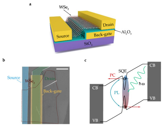 (a) Schematic sketch of the device structure with monolayer WSe2 over a step (height h = 105 nm). The WSe2 flake is contacted by Ti/Au (5/200 nm) electrodes and separated from the back-gate electrode by a 20 nm thick gate dielectric (Al2O3). (b) False-color scanning electron image of the device (Scale bar, 5 μm). (c) Schematic band diagram of a SQE photodiode for negative drain-source voltage (V DS). Following resonant optical excitation, single electron-hole pairs are generated and dissociated at the junction, which results in a PC [71].