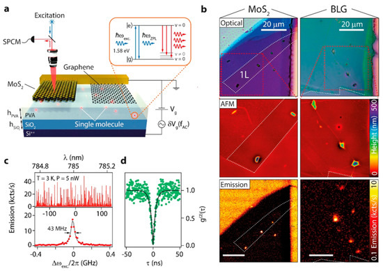 They believed that the generated and directly integrated quantum emitters (QEs) in III-nitride semiconductors are able to be used in different types of applications, such as optoelectronics, high-voltage power transistors, and microwave amplifiers. They also believed that the potential of high-quality QEs, monolithically integrated in a wide range of III-nitride device technologies, results in new quantum device opportunities and industrial scalability. In Figure 16a, the scalable AlN-on-sapphire photonic integrated circuits with integrated quantum emitters are shown. A wurtzite crystal structure of aluminum nitride (yellow: aluminum atom, black: nitrogen atom) is illustrated in the black inset. Microscopic images of the fabricated QE integrated waveguides and fiber edge coupling are shown in the blue inset. It can be seen that the grating couplers are used for visual feedback [72]. Atomic force microscopy images of a sample before and after annealing are presented in Figure 16b. After annealing and slight coalescing of the AlN film, the maintenance of the hexagonal structure of the nanocolumns can be seen. The close-up cross-section of the single-mode AlN-on-sapphire waveguide can be found in Figure 16c [72]. A tunable hybrid device consisting of lifetime-limited single emitters (line width ~40 MHz) and 2D materials at subwavelength separation without degradation of the emission properties was reported by Schadler and co-workers [73]. The tunability in the ultrabroadband range (>400 GHz) and fast modulation (frequency ~100 MHz) of the emission energy were achieved by an integrated, ultracompact tunable SPS (Figure 17). Figure 17a shows the schematic hybrid device. As can be found from the figure, atomically thin layers of graphene and MoS2, cover fluorescent molecules embedded in a polyvinyl alcohol (PVA) film. The thickness of PVA is 300 nm and the thickness of the SiO2 thin film is 285 nm. Red-shifted fluorescence of excited single molecules (inset) is detected with a single-photon counting module (SPCM) [69]. An optical micrograph, AFM topography, and DBT emission map for MoS2 (left column) and bilayer graphene (right column) devices are illustrated from the top to bottom of Figure 17b. The fluorescence excitation spectrum of an ensemble of single molecules in an uncovered nanocrystal at 3 K can be seen in the top panel of Figure 17c. Details of two emission peaks with a Lorentzian line shape (solid line) can be observed in the bottom panel of Figure 17c. The narrower peak shows an FWHM of 43 ± 7 MHz. Antibunching measurement of the resonant excitation of a single peak, as shown in part c, is shown in Figure 17d [73]. Hexagonal boron nitride is another wide-bandgap van der Waals material that is considered in this review. It has recently emerged as a promising platform for quantum photonic experiments.
