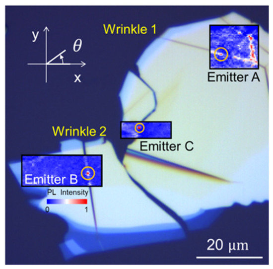 Previously, the formation and localization of narrowband quantum emitters in large flakes (up to tens of micrometers wide) of hexagonal boron nitride was studied by Choi et al. [74]. In their experiments, it was explained that electron irradiation or high-temperature annealing can be used to activate as-grown hexagonal boron nitride emitters and ion implantation or focused laser irradiation can be employed to increase the formation probability of emitters in the as-grown material [74]. Interestingly, it was realized that the emitters are always localized at the edges of the flakes, unlike most luminescent point defects in three-dimensional materials. The authors believed that their results constitute an important step in the roadmap of deploying hexagonal boron nitride in nanophotonic applications [74]. Additionally, single-photon emission from 2D hexagonal boron nitride (hBN) has been reported by others [75,76,77,78]. In comparison with other SPEs, the brightness of hBN is in the range of MHz without cavity enhancement, which is similar to what has been achieved previously in InAs QDs [79]. Stable and bright single-photon emitters (SPEs) which operate at room temperature have emerged using color centers in two-dimensional hexagonal boron nitride (h-BN) [79]. Recently, Yim et al. [80] reported the selective formation of vacancy-based SPEs at nanoscale wrinkles in h-BN. They showed that the optical dipole of SPEs preferentially aligned to the wrinkle direction. Their density functional theory calculations confirmed that in localizing vacancy-based SPE candidates, the wrinkle’s curvature and alignment of the defect’s symmetry plane to the wrinkle direction play crucial roles [80]. The wrinkle-induced generation of SPEs and their polarization alignment to the wrinkle direction were experimentally confirmed by optical measurement methods. They concluded that a new route to controlling the atomic position can be found in their results and the possible crystallographic origin of the SPEs in h-BN was revealed by optical property measurements. A microscopic image of the h-BN flake used in Yim et al. experiment is shown in Figure 18. The recent advances in hBN quantum light emission compared with other 2D material-based quantum sources and their performances were analyzed in [81]. In addition, state-of-the-art fabrication techniques of stable single-photon emitters in the UV, visible, and near-IR regions, their activation, characterization techniques, and photostability towards a wide range of operating temperatures and harsh environments were discussed [81].