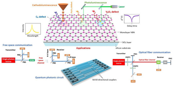 Schematic representation of three main quantum emitter hosts in hBN on Si/SiO2 substrate, emitting single photons of different energies and their unique applications [81]. The NBVN defect (nitrogen vacancy and boron replaces nitrogen) supplied the single photons that can emit the visible light and be used in quantum photonic circuits for quantum computing. Additionally, VBO2 defect (boron vacancy with oxygen (yellow) atoms) can provide single photons that can emit the near-IR light with potential for application in quantum communication based on optical fiber.