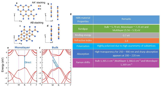 Schematic representation of hBN stacking, electronic band structure of monolayer and Bulk hBN and electrical/optical/crystal properties of hBN material. (a,b) Top view and side view of AA’ stacking. (c,d) Top view and side view of AB stacking. (e,f) Electronic band structure of monolayer and bulk hBN with direct and indirect band-gaps respectively. (g) General properties of hBN material and similar Raman shifts (around values) can be observed for high quality crystals [81].