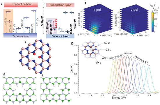 In Figure 21c–e, a boron vacancy with two oxygen atoms (VBO2 defect) is shown in red and boron and nitrogen atoms with dangling bonds passivated by hydrogen (white) are, respectively, shown in green and grey colors [81]. Figure 21f shows the enhancement of spontaneous emission () due to defect coupling with gold nanospheres. The effect of strain on the NBVN defect structure is presented in Figure 21g.