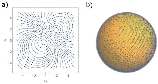 They are both centers. The phase portrait in the complex plane is depicted in Figure 1a, while the corresponding vector field on obtained by means of (32) is displayed in Figure 1b.