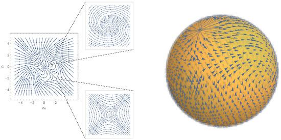 By way of example, we have depicted the phase portrait for a choice of such that and in Figure 2. As observed in first panel in Figure 2, we have two stable foci and a saddle. However, recalling that this chart covers only the part of the Bloch sphere excluding the north pole, we also depict the corresponding vector field on in the second panel in Figure 2 from which it is clear that there is an additional critical point at the north pole, which is an unstable node.