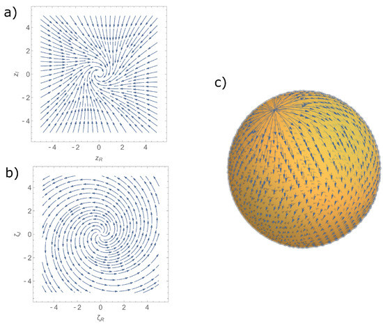 Phase portrait of the vector field associated with the quantum decay from the higher energy to the lower energy with damping parameter . In (a) the vector field is plotted using the chart with coordinates defined in Equation (32). In (b) this vector field is plotted using the chart with coordinates defined in Equation (32). Finally in (c) the vector field is plotted in the Bloch sphere.