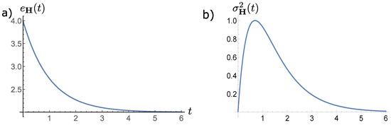 Its evolution is plotted in Figure 4b. From this figure, one may observe that the uncertainty of the energy starts at zero, then increases up to the maximum value at . After this maximum, the curve decreases asymptotically to zero. Since is the statistical fluctuation around the expectation value, it follows that a measurement of with complete certainty is only possible in principle at the initial and final times.