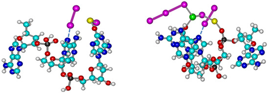 Complexes of active centers the FS-1 drug (LiI3 complex IV, MgI3LiI3 complex V) with nucleotide triplet AAG. Blue balls are carbon atoms, red—oxygen, dark blue—nitrogen, violet—iodine, green ball—magnesium ion, yellow—lithium ion, black—phosphorus, and white balls—hydrogen atoms.