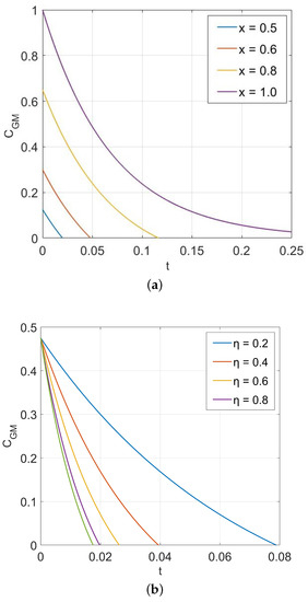 Since is a positive and increasing function of both time and temperature, therefore, the region for which the state has genuine multipartite entanglement shrinks with the increase in time and temperature. More precisely, at , the state has genuine multipartite entanglement for the region , where . A few qualitative conclusions can be made without specifying the specific form of spectral density of the reservoir and relying on the fact that is a positive and increasing function of time. It is immediately obvious that the region of mixing parameter x for which the state is genuine multipartite entangled decreases with the increase in time, the rate of which depends on the specific reservoir under consideration. Furthermore, for a given mixing parameter x, the correlation will decay with time, and the state encounters the sudden death of multipartite entanglement after a finite preservation time, as shown below for various spectral densities.