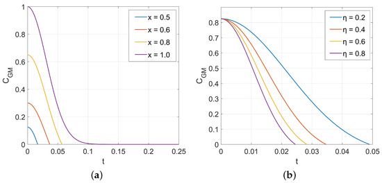 which in general is difficult to evaluate. We will evaluate the damping factor for the case of zero, low, and high-temperature regions and study the correlation in these limits. Firstly, at the zero temperature, the damping factor is obtained to be . For this case, genuine multipartite concurrence for tripartite systems (n = 8) is plotted for various mixing parameters at fixed and various interaction parameters at a fixed mixing parameter, as shown in Figure 2. It is observed in this case that the decay in correlation is not exponential, which is a consequence of the logarithmic factor of time in the damping factor. We observe the sudden death of genuine tripartite entanglement for states with mixing parameter ; however, compared to the linear damping factor case, the sudden death is achieved much more slowly. The preservation time is evaluated to be