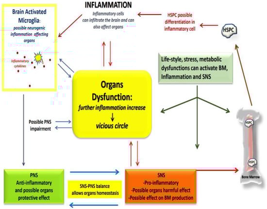 Complex crosstalk involved in organs dysfunction. The figure illustrates an example of the complex cross-talk existing among organs. It is based on studies describing neuro-immune pathways which can create a vicious circle: this phenomenon occurs when there is reciprocal crosstalk among the nervous system, immune system, and organs and can over-activate both immune or neuro-immune reactions, making it extremely difficult to understand the triggering events and consequently the precise mechanisms of action. This negatively affects the discovery of new therapies. For example, sympathetic nervous system (SNS) activation can induce extravasation of haematopoietic stem and progenitor cells (HSPCs) from the bone marrow. HSPCs can differentiate in haematopoietic, repairing, or inflammatory cells. Inflammatory cells can reach the brain, differentiate into microglia (brain inflammatory cells), and start cytokine production (molecules responsible for inflammatory response), leading to neuro-inflammation with consequences for organ homeostasis and likely affecting para-sympathetic nervous system (PNS). Neuro-inflammation in the brain and circulating inflammatory cells can also directly affect PNS and organs. A multi-organ approach is therefore required, but current biochemical approach still fails to explain this complex cross-talk, preventing the development of new effective therapies. Quantum biology research might open new perspectives in exploring and decode this cross-talk network.