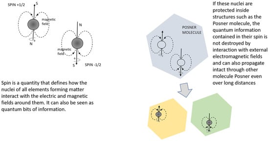 Posner molecule mechanism description: spin values for elementary particles (electron, proton, neutron). In a nucleus the total nuclear spin is the combination of spin of each nucleon and their angular momentum inside the nucleus. Spin is an intrinsic angular momentum of subatomic particles. Nuclei with spin value different from 0, interact with the electric and magnetic fields around them. It can also be seen as quantum bits of information. Phosphorus exists in the monoisotopic form 31P with spin ½ so a couple of such atoms in a molecule can be entangled. The quantum information contained in their spin protected inside structures, such as the Posner molecule, is not destroyed by environmental interaction and it can also propagate through other molecule Posner keeping information intact even over long distances (with respect to neurons’ distances in the cerebral tissue) in a relatively long time period (millisecond).
