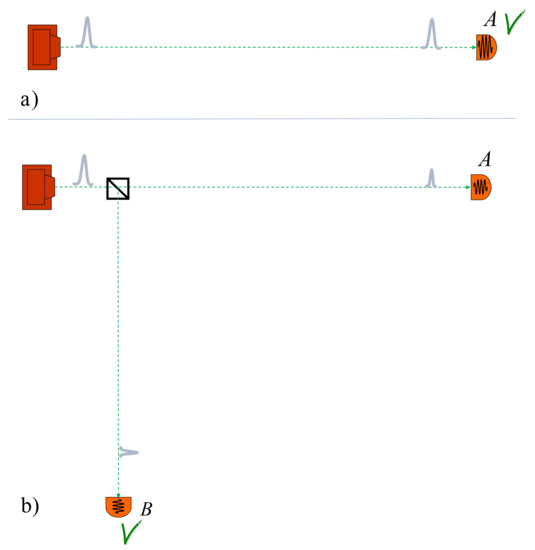 Let me state here what I view as the measurement problem. Today, we build single-photon sources and single-photon detectors and quantum physics explains well the process of photon emission and detection by describing the wave packet of the photon and the particular wave pattern of the ingredients of the single-photon detector, Figure 1a. If we add a beam splitter and another detector, Figure 1b, the equations of quantum mechanics provide similar wave patterns in the two detectors, A and B. Nevertheless, we never observe two simultaneous detections of a single photon by two detectors. This tension between the empirical evidence (single detector clicks) and the physical picture (both detectors change their quantum states) is the measurement problem.