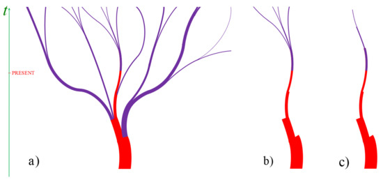Up until a particular point in time (our present), there is no difference in our experience between the single world of the universe in which quantum mechanics includes collapses at every quantum measurement and the corresponding world of the MWI universe. In Figure 3a, the whole tree of worlds of the MWI is schematically shown, in Figure 3b, our world until the present and all our future worlds, and in Figure 3c, the corresponding world of the universe with collapsing worlds is shown. There is no difference in the description of the past between the MWI and the theory with collapse at every measurement. However, there is a difference for the future. While in the collapsing universe there is a diachronic identity of the world towards the past and future, in the MWI, there is no diachronic identity towards the future.