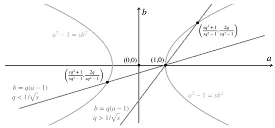 The geometric way [13] of dealing with Equation (10) is to draw a line in the -plane passing through with a rational slope ; for example, the line (see Figure 2). For , this line will cut the curve (10) at another point,