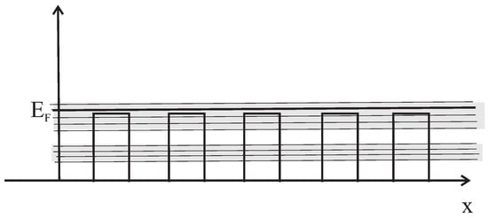 Moreover, in a metal the conduction electrons belong in general to an allowed band that includes energy levels with and , that fill the levels up to the Fermi energy . A sketch of the obtained solution for five barriers is shown in Figure 2, in which the Fermi level, allowed bands and energy levels with perfect transmission across the whole lattice are shown.