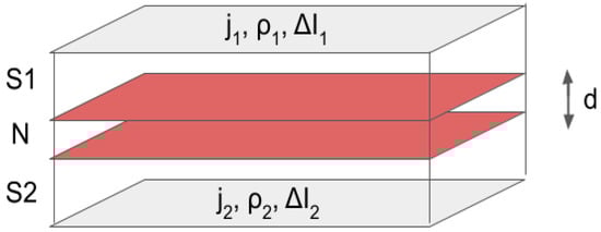 In order to estimate the magnitude order of this field we recall the Equation (7) for the anomalous dipole emission. This formula is exact for a classical mono-chromatic field proportional to , but we can use it as an approximation for a stochastic field. We know that the quantum noise of an harmonic oscillator has a spectrum peaked at its frequency [38,39]. Admitting that there can be some spread in frequency and a random superposition of modes with frequency , we still can assume the time derivative of P to be of the order of . P itself is of order , where V is the effective volume of one electrode, d is the distance between the electrodes (thickness of the junction) and is the magnitude order of the fluctuations of I on each electrode, as given above.