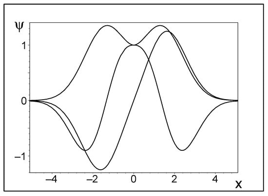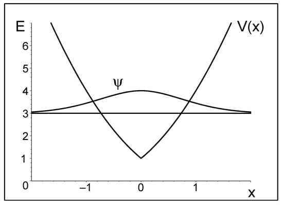 Clearly, function (10) obeys the standard matching conditions in the origin (i.e., it has a continuous logarithmic derivative there) and it solves our bound-state problem (2) + (11) at . Thus, QES expression (10) represents the exact even-parity ground-state wave function. In Figure 2 our QES choice of parameters has been used for illustration purposes. The similar elementary QES feature also occurs after one moves to the double-well dynamical regime.