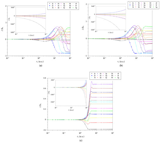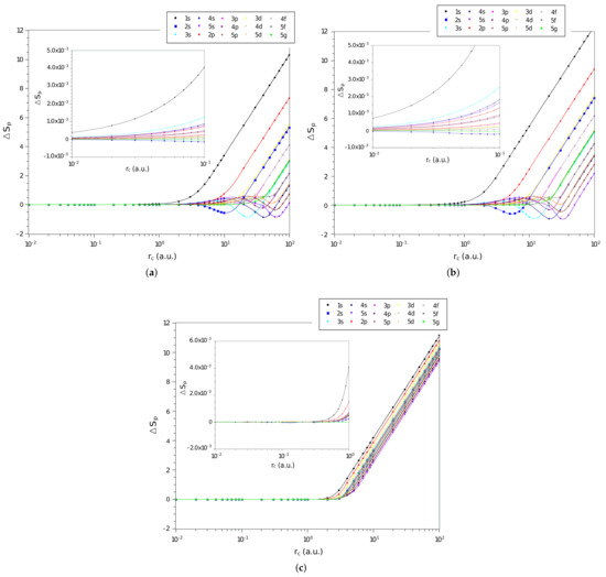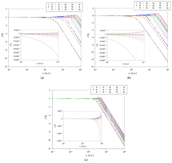 In Figure 2a–c are shown the difference, , between the values of momentum space entropy of each of the three systems and that of the particle confined in a spherical cage, calculated from Equation (17), as function of on a logarithmic scale, for the confined hydrogen atom, the confined ion in a strongly coupled plasma and the spherically confined harmonic oscillator, respectively. We have displayed in Figure all states with principal quantum numbers and . We observe similar behavior to that of position space entropy when the confinement radius tends to zero, decreasing its amplitude gradually to zero. This confirms that the interaction potential is no longer important for rigorous confinements and the system starts to behave like an electron confined in a spherical cage.