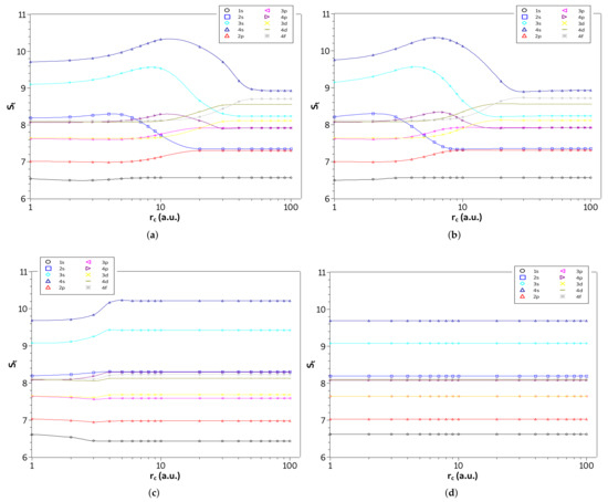 Furthermore, in Figure 5a–d are shown the entropy sum, , of the four systems as function of on a logarithmic scale in the weak and intermediate regions (). We plot all states with principal quantum numbers and . Thus, it becomes clear from the figures for approximately which confinement radius, , a given state of a specific system is in its lowest entropy sum configuration. Specifically, the state is always the lowest entropy sum for all systems studied. On the other hand, some states have the lowest entropy sum for intermediate values of , while others have a lower entropy for the free configuration or in the strong confinement region. Moreover, we see that for the confined hydrogen atom and the ion confined in a strongly coupled plasma the states with angular momentum quantum number s (except the state) are the most affected by confinement, while for the harmonic oscillator the and states, although affected, decrease their entropy sum.