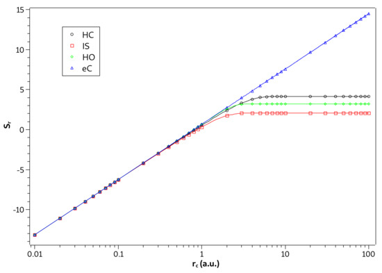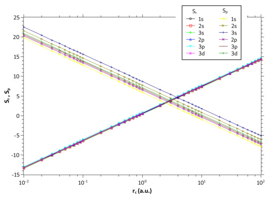 In the atomic, molecular and chemical-physical context we define the informational entropies (or Shannon entropy) on position, ; on momentum, ; spaces; and the entropy sum, , by adding and [28,29]. These informational quantities have been utilized in the study of various confined quantum systems such as the confined hydrogen-like atoms [30,31,32,33,34,35], the confined He-like atoms [36,37], plasma environments [38,39], and in many other systems [40,41,42]. Analysis of basis functions [29,43] and electronic correlation [36,44,45], as well as physical and chemical phenomena [46,47,48,49] are also being approached in the informational field.