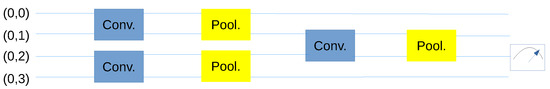 The notion of using a quantum circuit as a classifier or clustering algorithm began to attract attention more than two decades ago [49,50,51,52,53,54,55]. The concept of the classical neural network has been filtered into the idea of quantum classifiers in recent years [1,56,57,58,59,60,61,62,63,64,65,66,67,68,69,70,71,72,73,74,75,76,77]. The classical neural network consists of links and neuron units represented by activation functions, which are organized in a layered structure. The key properties of CNN are translationally invariant convolution and pooling layers, each characterized by a constant number of parameters (independent of the system size), and sequential data size reduction (i.e., a hierarchical structure) [78].