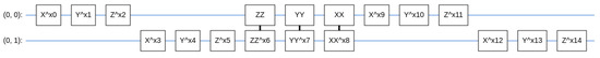 Variational wavefunction for the TFIM in the Tensorflow Quantum database, for [86]. The notation of the quantum gates is adopted from the Cirq [87]. H is the Hadamard gate, X is the Pauli X gate with the rotation angle associated with the number, and ZZ is the Ising coupling gate with the rotation angle given by the associated number. An Ising coupling rotation is given explicitly as for the rotation along the z direction, and similarly for the rotations along the x and y directions. are the four parameters for the wavefunction.