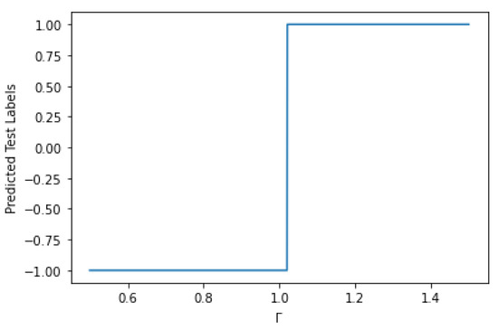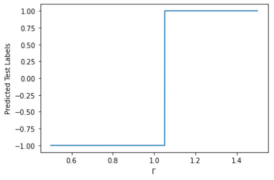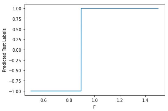 Predicted test labels vs for . The predicted labels jump at .