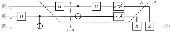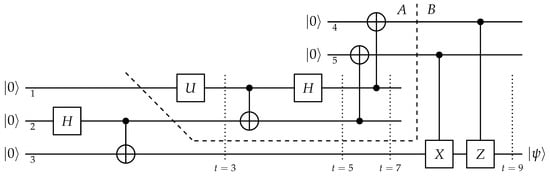 The descriptors in quantum teleportation. The computation starts with all qubits properly initialized to , which, for conciseness, is denoted without time dependence as . When entering a gate, the components of the input are shuffled into the output in accordance with the action of the gate, which is prescribed by Equations (5), (6) and (8). The information flow of the parameters and , encoded in , is highlighted in dark grey, with the wires thickened. It spreads locally in the network through the interactions, and, as can be seen, the “classical” bits are responsible for carrying the parameters encoding Alice’s system over to Bob’s location.