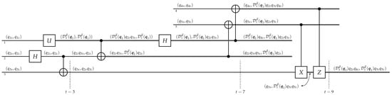 Suppose that between the discrete times and t, only one gate is performed, whose matrix representation on the whole network is denoted . Therefore, , where V consists of all gates from time 0 to . The evolution of descriptors can also be expressed in a step-by-step fashion,