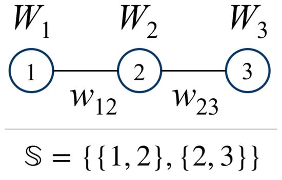 As shown in Equation (1), a QUBO is defined by two separate summations of weighted values. The first summation evaluates weights  associated with each individual binary variable, while the second summation accounts for pairs of variables which share a weighted connection . In this study, we adopt the typical interpretation of QUBOs as graph problems, whereby each binary variable  represents a node. We can then define the connectivity of a QUBO graph using the set , which itself is a collection of sets that describe each pair of nodes  and  that share a connection. See Figure 1 below for an example.