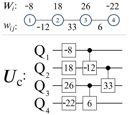 Applying P() to a qubit only affects the  state, leaving  unchanged, and similarly only  for CP(). However, this is exactly what we need in order to construct C(X) from Equation (1). When evaluating a particular binary string X classically, only instances where the binary values  are equal to 1 yield non-zero terms in the summations. For quantum, each binary string X is represented by one of the  basis states . Thus, our quantum cost oracle  can replicate C(X) by using P() and CP() to only effect basis states with qubits in the  and  states.