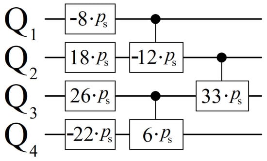 Shown above in Figure 3 is an example of a 4-qubit QUBO cost oracle, where the weighted values  and  are used as the  parameters for the various phase gates. This quantum circuit can be generalized to encode any QUBO as defined in Equation (1): single qubit P() gates for the summation of  terms and two-qubit CP() gates for the summation of  terms. If we wish to go beyond quadratic cost function terms in C(X), then we can use N-qubit control phase gates to encode weights which depend on N binary variables.