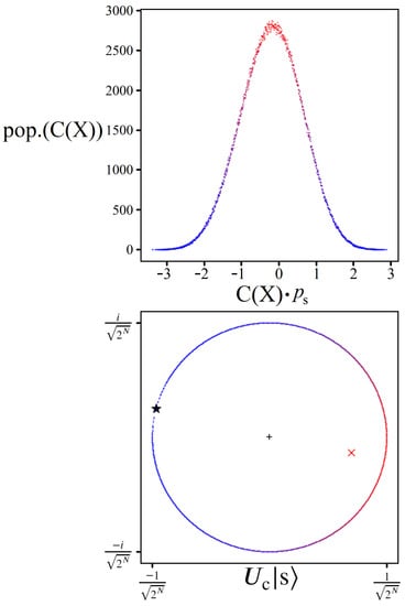 Indeed, the histogram is approximately Gaussian; importantly, however, it has imperfections resulting from the randomized weights. At large enough problem sizes (around ), these imperfections have minimal impact on a problem’s aptitude for amplitude amplification, which is one result from our previous study []. Similarly, another recent study [] has demonstrated that, in addition to symmetric Gaussians, solution space distributions for both skewed Gaussians and exponential profiles lead to successful amplitude amplifications. The commonality between these three distribution shapes is that they all possess large clusters of solutions that are sufficiently distanced from the optimal solutions that we seek to boost. This can be seen in Figure 2 as the location of X and X as compared to the central peak of the Gaussian. When appropriately encoded as an oracle , these clusters serve to create a mean point in the complex plane which the optimal solution(s) use to reflect about and increase in probability.