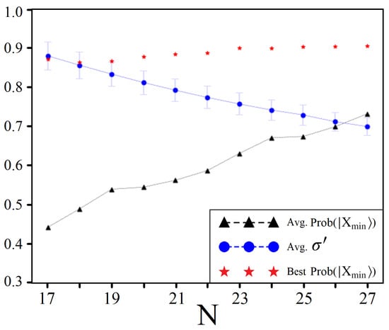 The relation between N, , and the highest prob.() from Figure 6 can be summarized as follows: larger problem sizes tend to produce smaller standard deviations, which in turn lead to better probabilities produced from amplitude amplification. However, there is a very apparent disconnect between the probabilities capable of each problem size (the red stars) versus the average (the black triangle). To explain this, we must first introduce the quantity X provided in Equation (18) below.