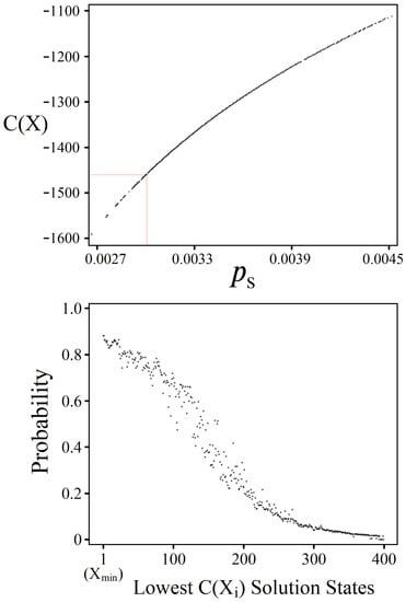 (top) A plot of the 400 lowest C(X) values as a function of  for the X QUBO from Figure 7. Each data point represents the  value at which the  state(s) is most probable. The red box in the lower left corner represents the  region depicted in Figure 10. (bottom) The probabilities achieved for these 400 lowest  states using the  values are shown in the top plot. Each state is plotted in order of its rank from 1 (X) to 400 (the 400th lowest C(X) solution).
