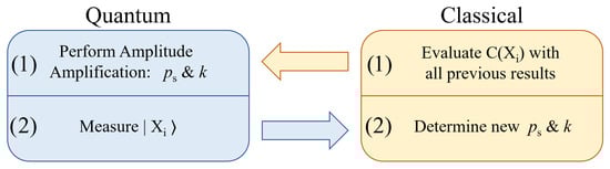 The quantum strategy for finding the optimal solutions to C(X) investigated in this study is amplitude amplification [,,,,,], which is the generalization of Grover’s algorithm []. The full algorithm is shown below in Algorithm 1, which is almost identical to Grover’s algorithm except for the replacement of Grover’s oracle  with our cost oracle .