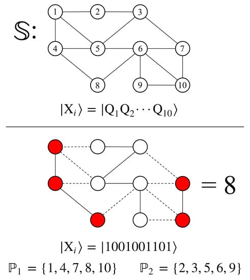 The unitary U from Equation (A6) is the required operation for representing the cost oracle in Equation (31). If two nodes (qubits) share a connection in , then a ‘cut’ corresponds to them being partitioned into different sets, which is represented by the qubit states  and . Figure A2 uses the operation in Figure A1 to create the complete  circuit for encoding all 15 connections in .