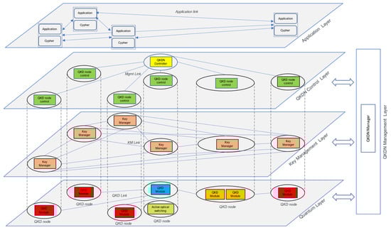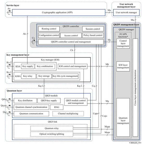 As extracted from the above-mentioned ITU-T recommendations, a QKDN functional architecture is composed of the following functional layers: