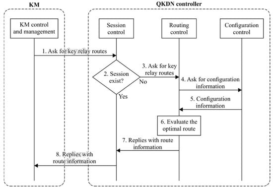 - Session control—the session control function supports the communication between KMs to establish the end-to-end key relay route or to supply keys to cryptographic applications in the service layer of the user network. The session control function initiates, maintains, and terminates the session.