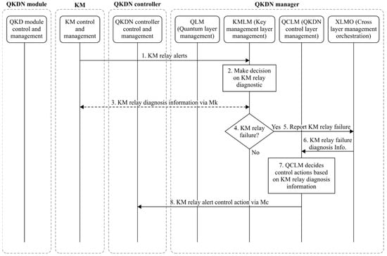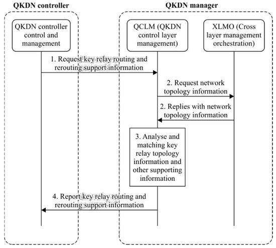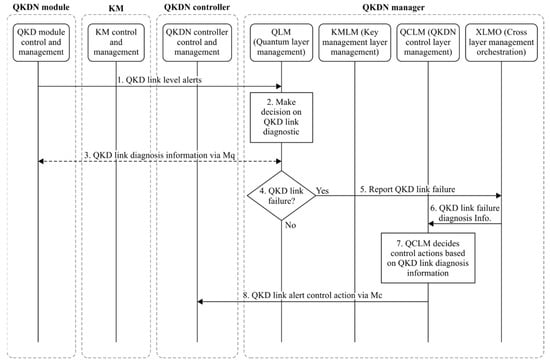 - A QKDN management layer—A QKDN manager located in this layer monitors and manages the QKDN as a whole. The QKDN manager gathers information about the performance of QKD modules and QKD links (including quantum relay points) in the quantum layer and key management information in the key management layer, to monitor these two layers. Moreover, the QKDN manager interacts with the QKDN controller to support the management and control functions of the QKDN. The basic functions are as follows: