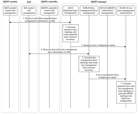 Specifically, the QKDN topology discovery scenario has been investigated, in compliance with the procedure recommended by ITU-T Y.3804, illustrated in Figure 7. Each QKDN resource sends to the QKDN manager configuration information that is used to create the QKDN resource inventory and the QKDN topology. For each QKDN resource (e.g., the QKD module, QKD link, and KM), said configuration information contains the following: