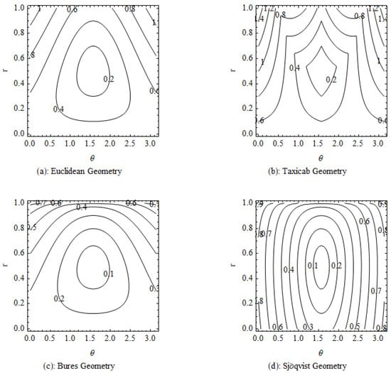 . This latter inequality is consistent with our visual intuition associated with seeing these points as mixed states inside the Bloch sphere. Clearly, these different geometric features between Bures and Sjöqvist geometries can be ascribed to the formal structure of the expressions for the finite distances in Equations (