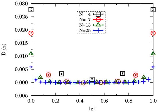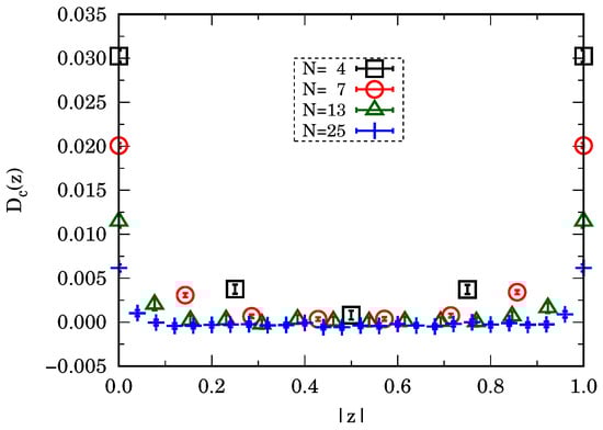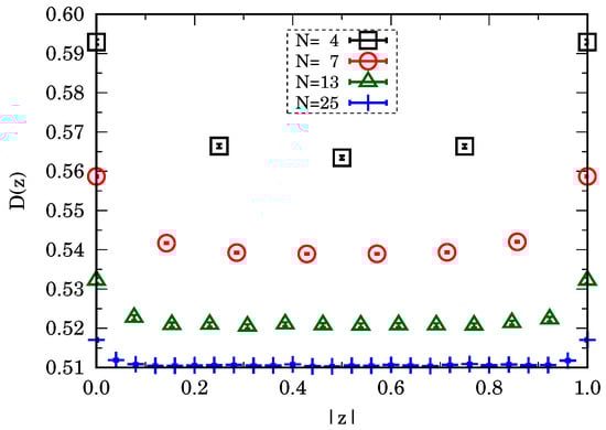Alternatively, we could adjust, at each change in N, the value of the bare mass, m, to have a fixed value for the renormalized mass, . This would result in a convergence toward a unique two-point connected function in the continuum limit, . We did not adopt this strategy because numerically tuning the bare mass to maintain the same value for the renormalized mass at each N proves problematic. This is what we did in some of our previous papers [,,,,,,,,]. As explained in those works, keeping the renormalized mass constant is extremely cumbersome due to the unavoidable systematic numerical error that one faces. It would then have been extremely difficult to achieve a reasonable comparison between the two-point functions at different values of N.
